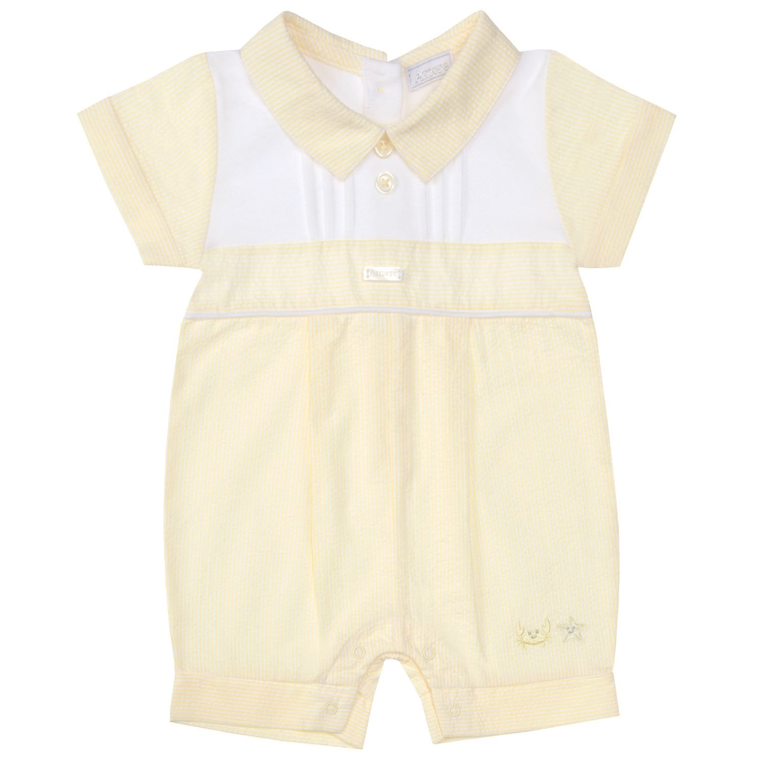 - Sleeves, lower body and collar are in lemon with a white thread running through to look like pinstripes. Top section is in white with three tucks each side with two lemon buttons to the centre. Central band with the material in the opposite direction, inverted pleats running down the legs. Embroidery in lemon of a crab and star fish to the lower left leg. Fastens at the top back with lemon buttons and between the legs with poppers.