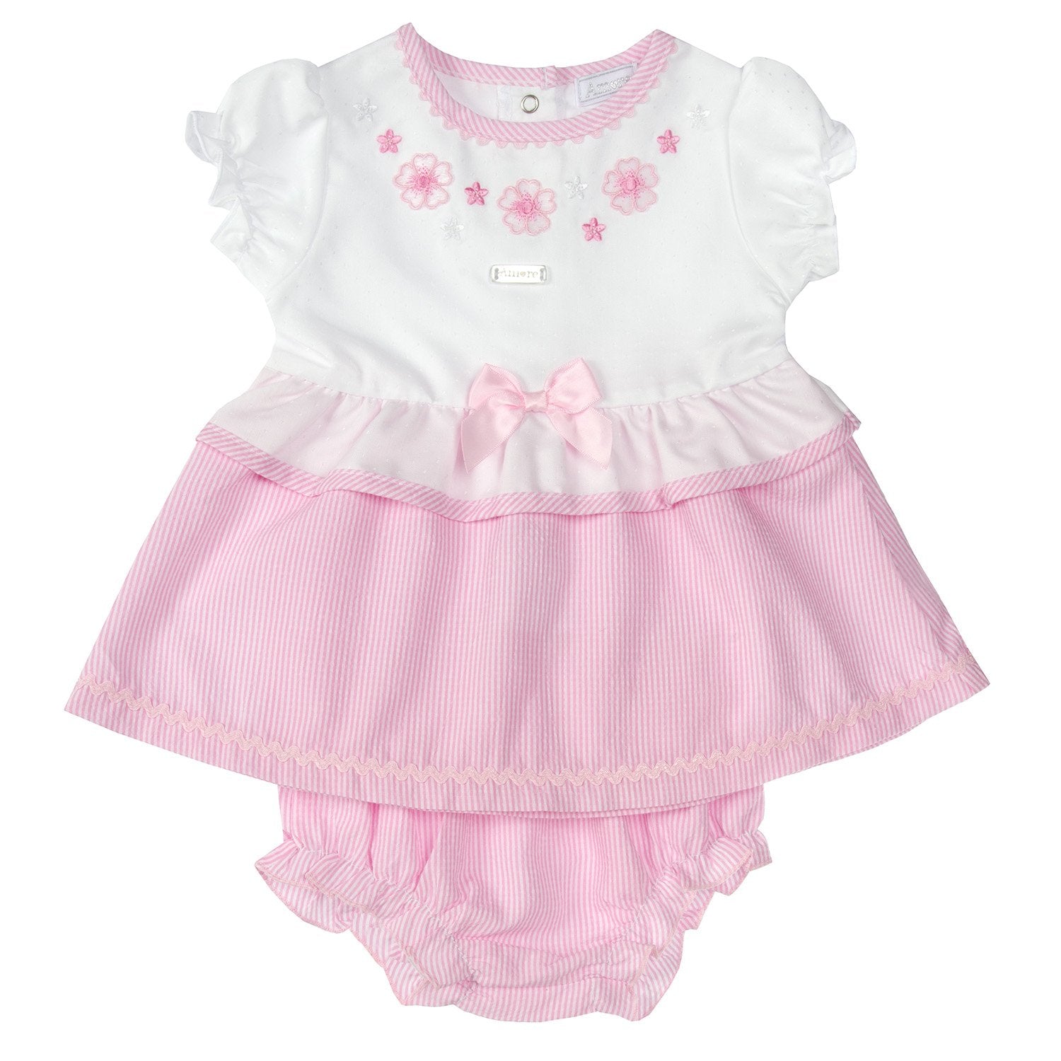 - The top section of this dress is in a white with all over self coloured fleck. The short sleeves have a gathered edge. A pink and white stripe to the neckline. Applique pink flowers to the front chest with embroidered flowers in white and pink. The lower section of the dress is in the white and pink stripe, then a rara of the white trimmed with the stripe. One central pink ribbon bow to the top of the rara. Fastens 3/4 of the way down with poppers.