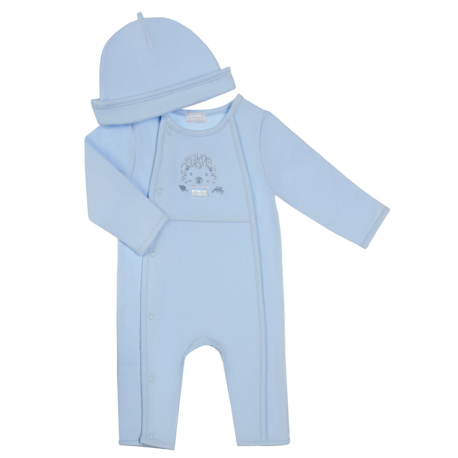 - Romper is long sleeved and legged, with an embroidered hedgehog face to the chest in white and pale blue threads. Fastens down the right front side with poppers all the way down.