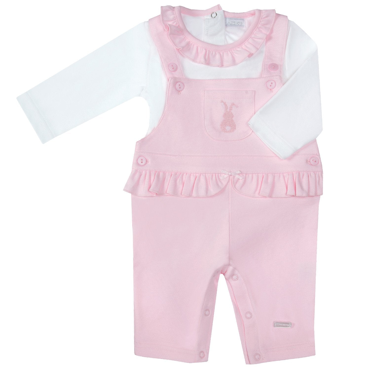 - Dungarees are in pink with an embroidered cross stitch bunny to the front on a pocket to the chest. Ruffle detailing to match the collar just below the wasit band. Fastens at the straps with two pink buttons and at the sides with the same buttons. Poppers between the legs.