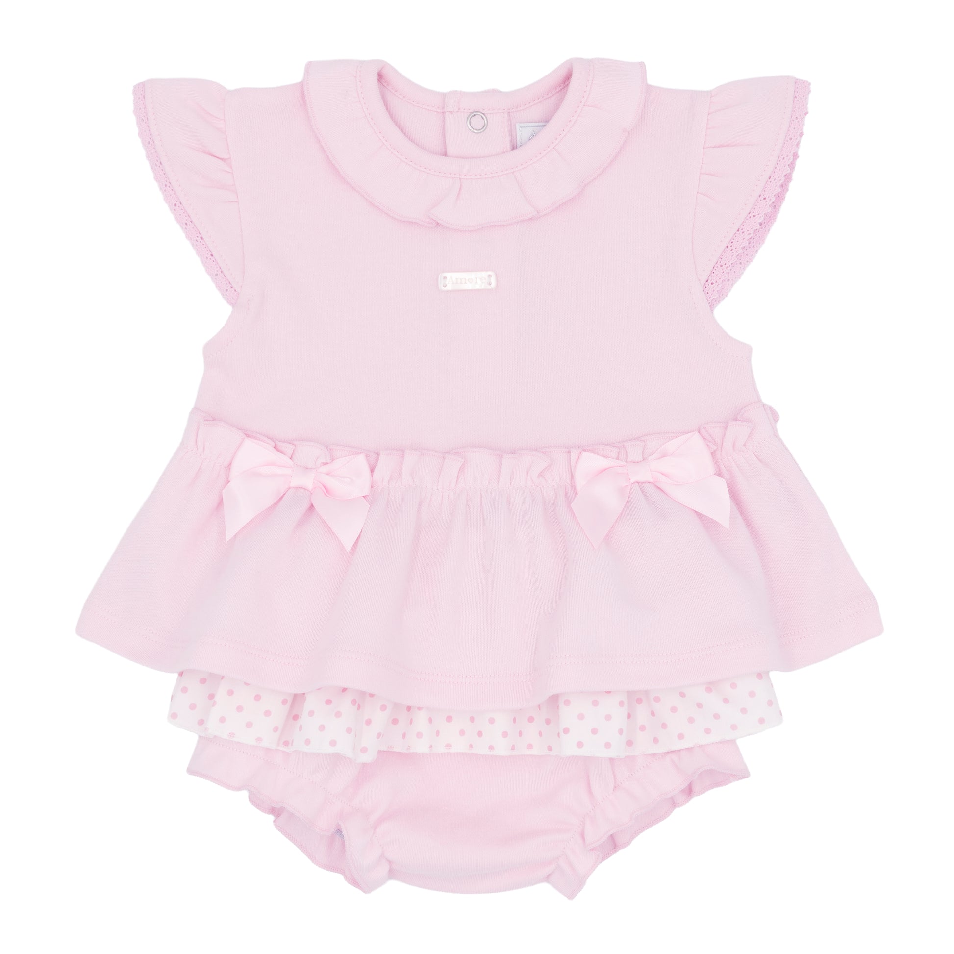 - The t-shirt top is in pink with a ruffle to the neckline, cap sleeves trimmed with pink cotton lace. A second lower section is added and then gathered to look like a rara. Two ribbon bow sin pick to the side fronts of the rara. Fastens at the top back with poppers.