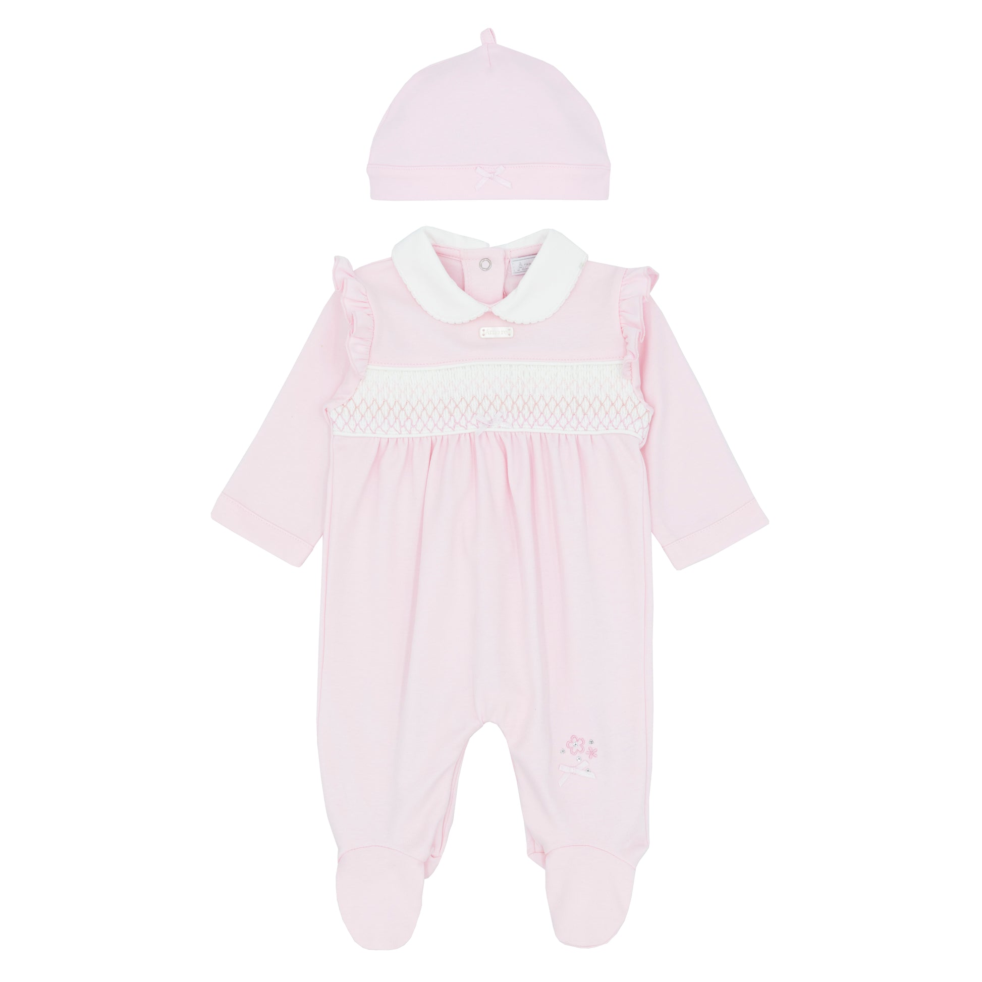 - All pink with a central panel of smocking with ombre embroidery, shades of pink to white. A ribbon pink bow to the centre.