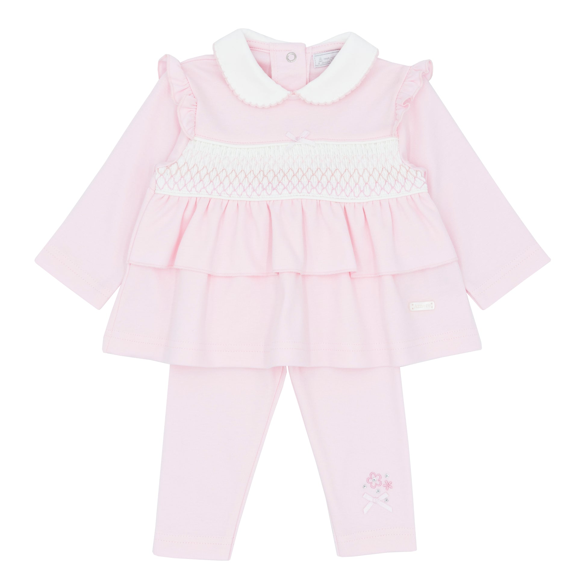 - Top is in pink, long sleeved. Central panel of smocking with ombre embroidery, in shades of pink going to white. A pink ribbon bow just above this to the centre. Just below is a rara to the top all the way around. Shoulders have a ruffle to the top. Finished off a white rounded collar trimmed with pink stitches. Fastens at the back half the way down with poppers.