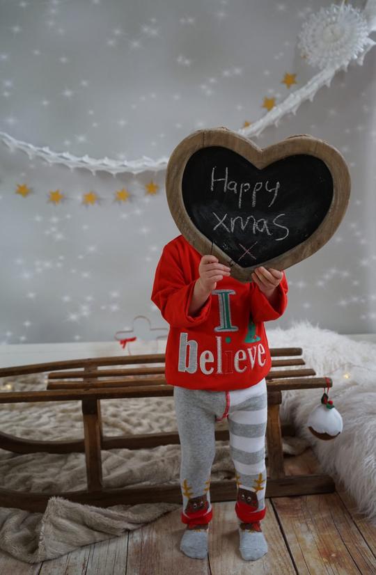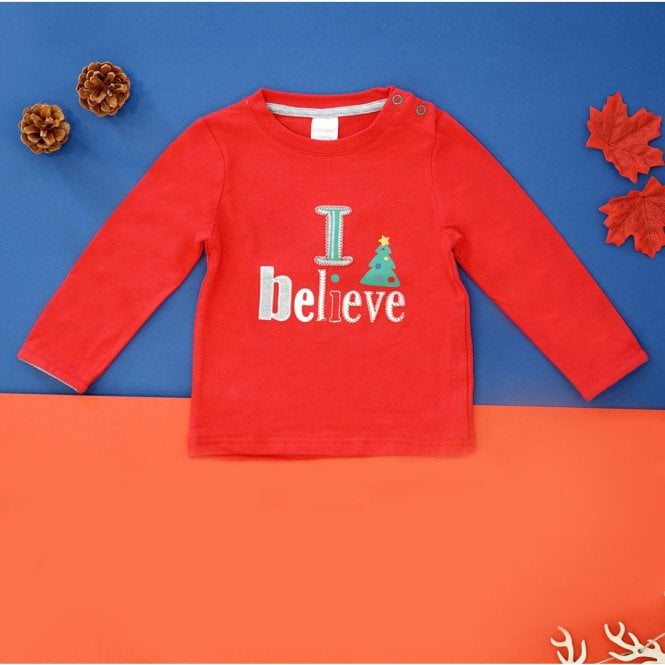 - Christmas will be looking super stylish in this long sleeve red top with the words I Believe on the front.