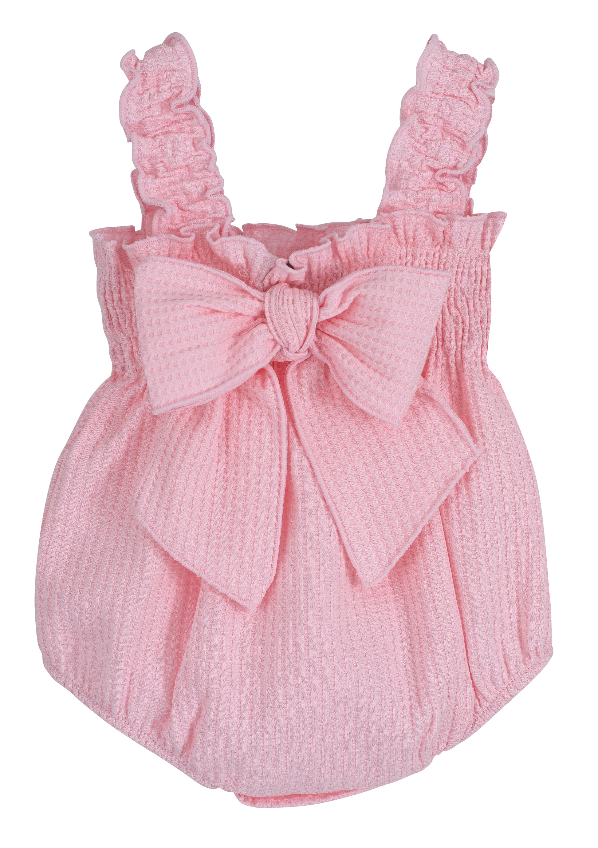 - Romper has straps, band of stretching elastic to the chest with ruffle to the top. Fastens between the legs with shell buttons. Bow to the back.