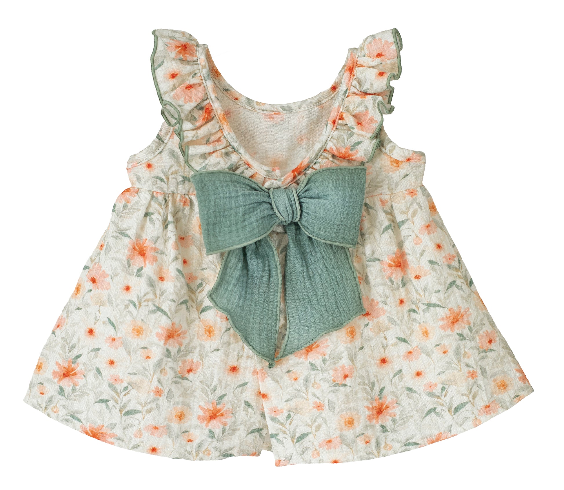 - Dress is vest sleeved with frill to neckline. All over print of green peach and coral floral design. Fastens down the back with buttons and has a green bow to decorate.