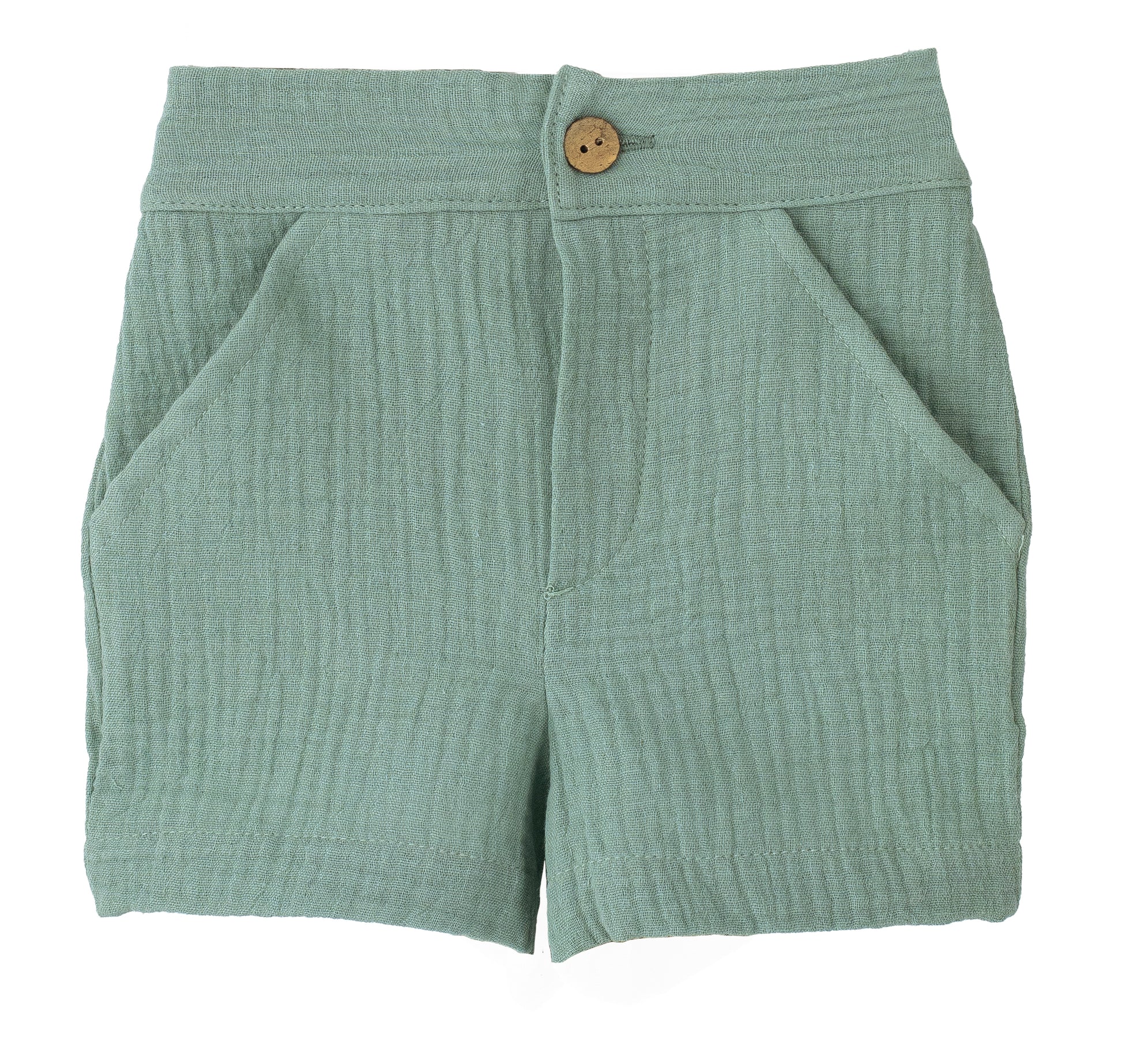 - Green shorts are in a waffle, elasticated waist wood button to fasten at the front. Side pockets.