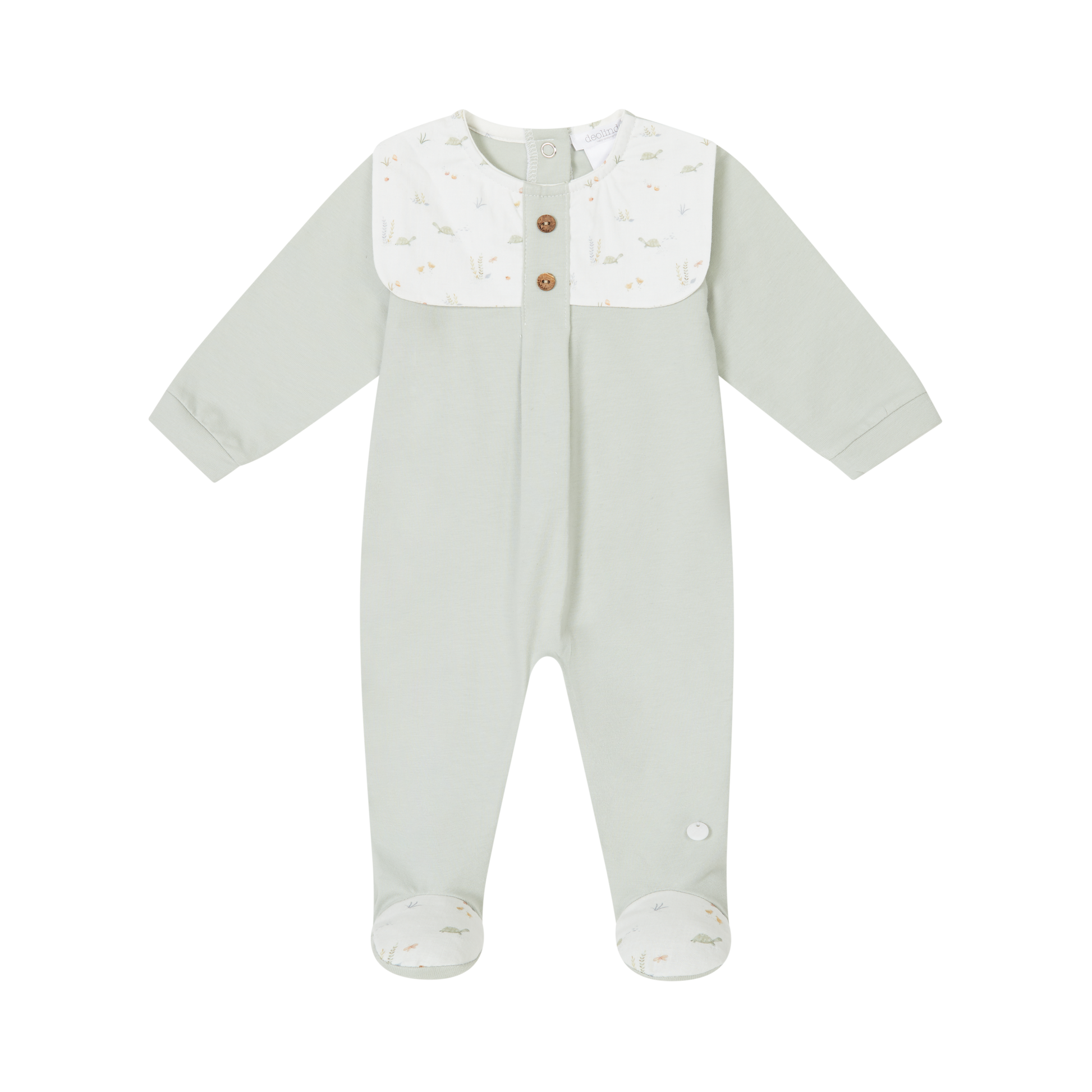 - Beautiful sage green baby grower with bib detailing.