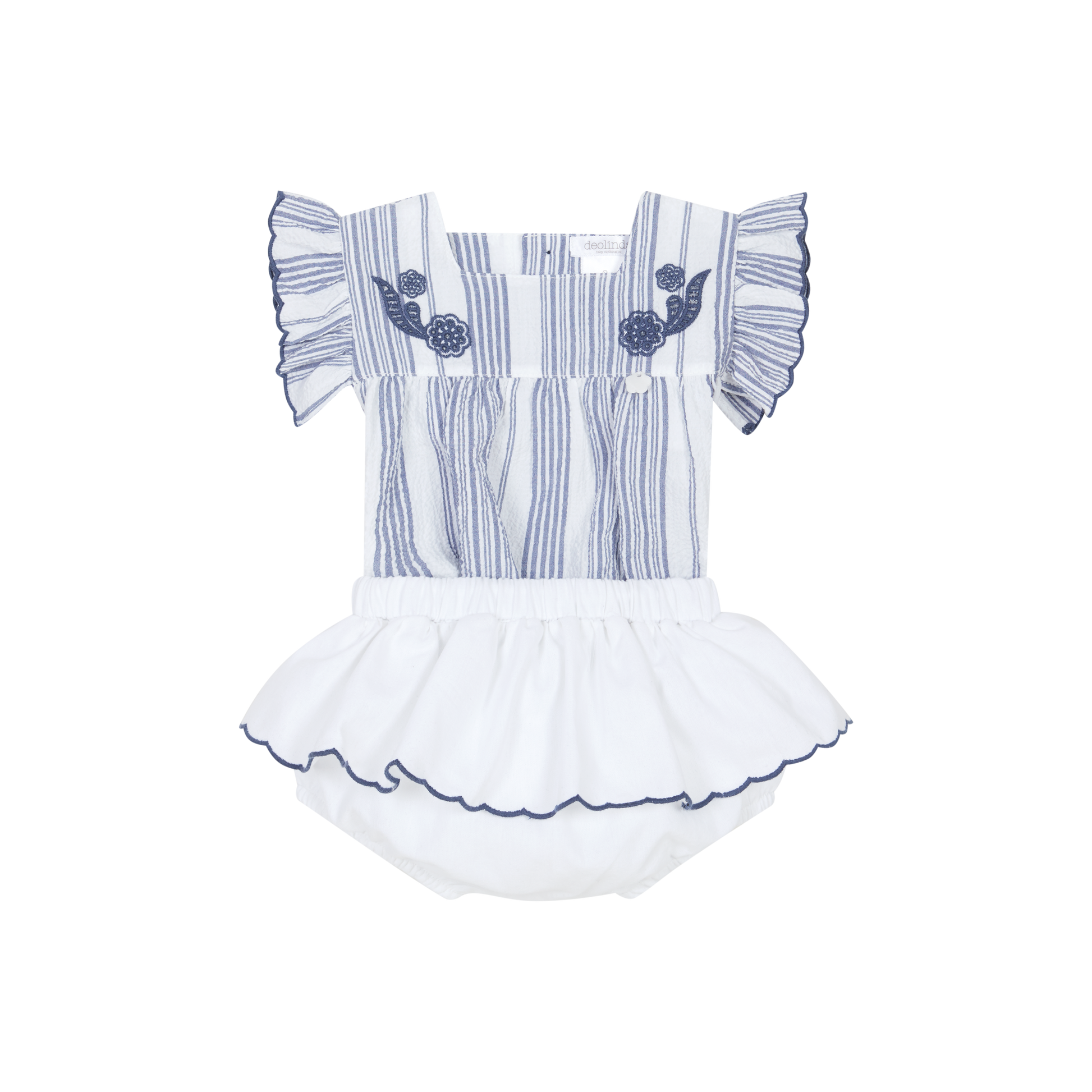 - White top with denim blue stripes. Little cap ruffled sleeves, a square neckline. The top section of the top has applique embroidered floral design in the blue at both sides. Fastens at the back with white buttons.