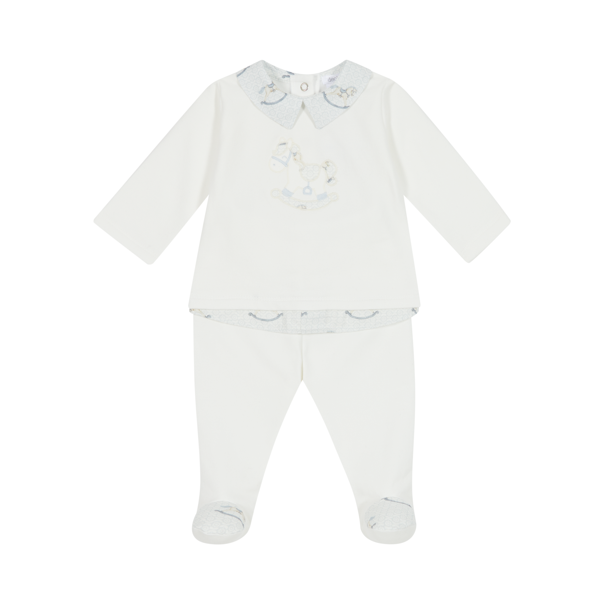 - Top is in ivory with a pale blue patterned collar with rocking horse print and a lower edge to the front in the same material, so it looks like a sweatshirt with a shirt underneath. Applique to the chest of a rocking horse in pale blue. Fastens down the back with poppers.