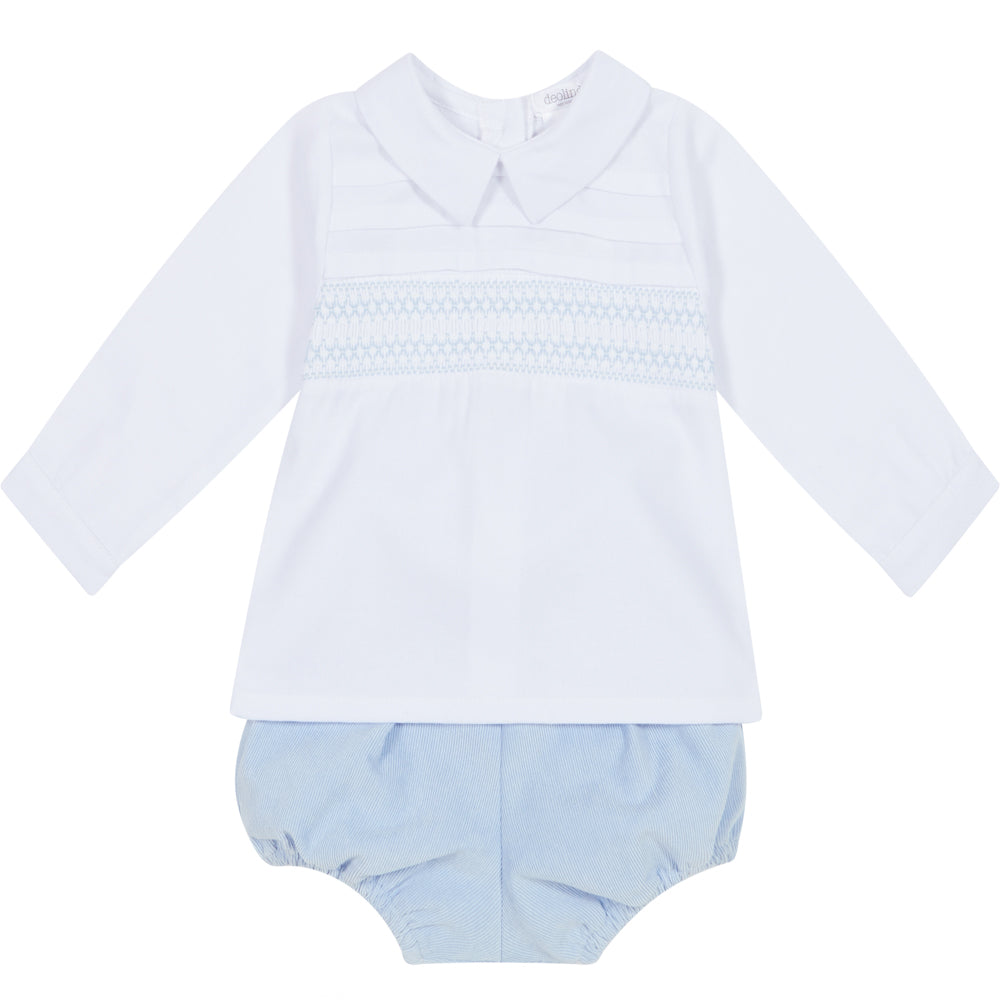 - Shirt is long sleeved and white with a pointed collar. Pleated detailing to the chest with a band of white and pale blue smocking just below.