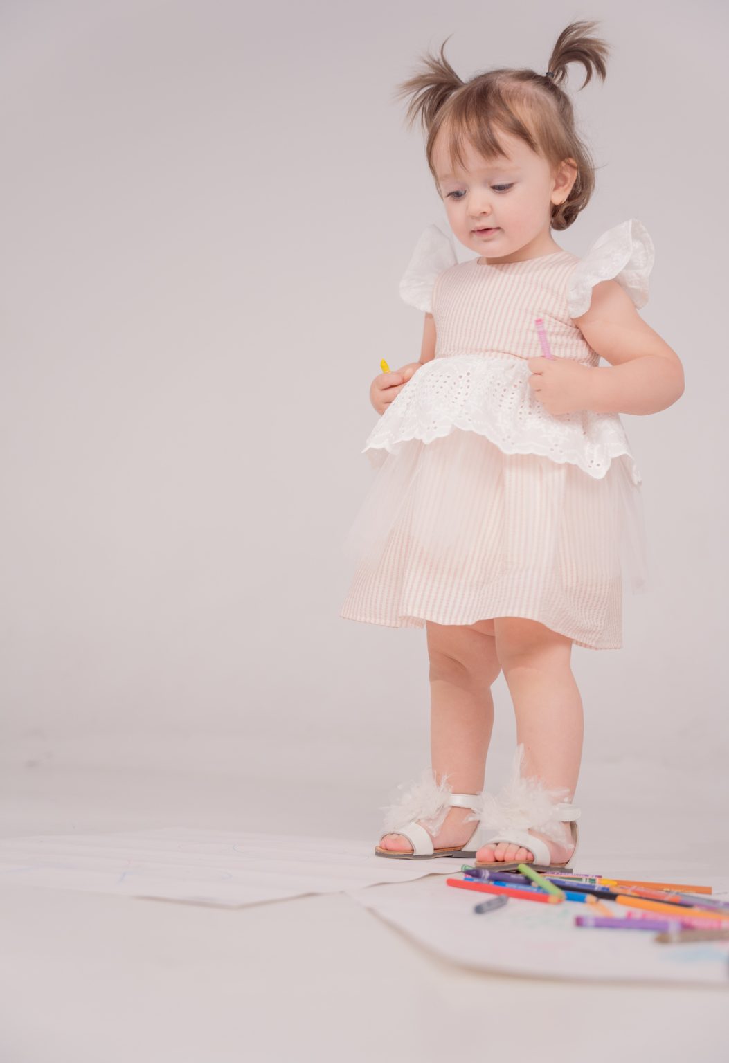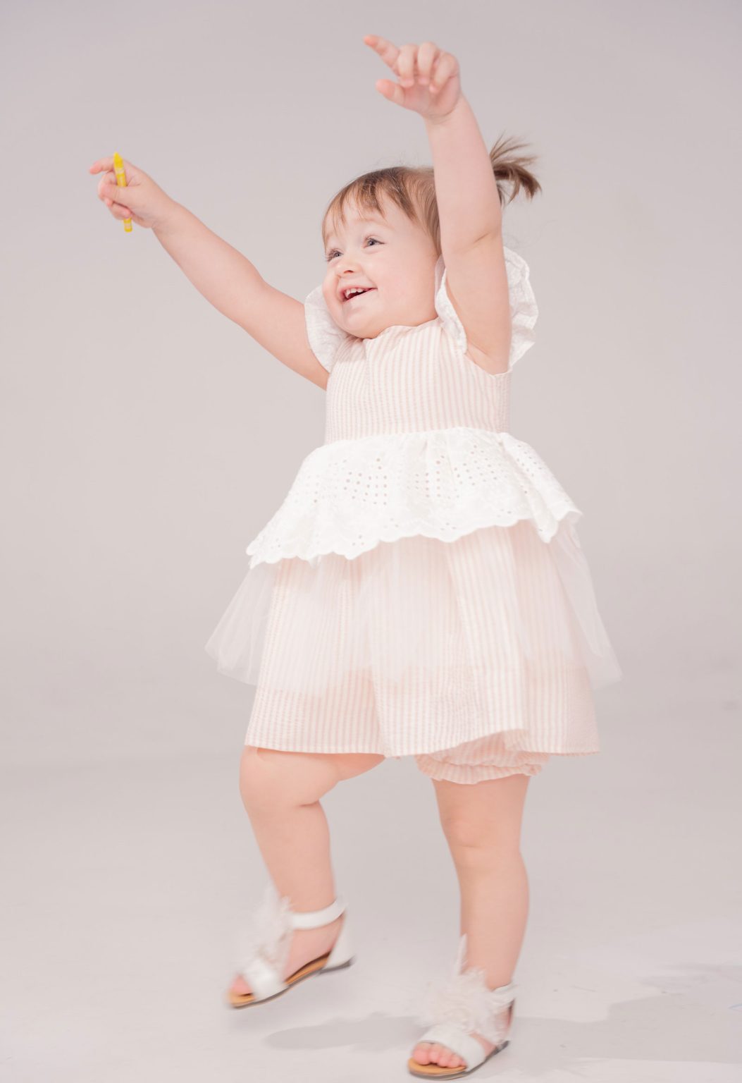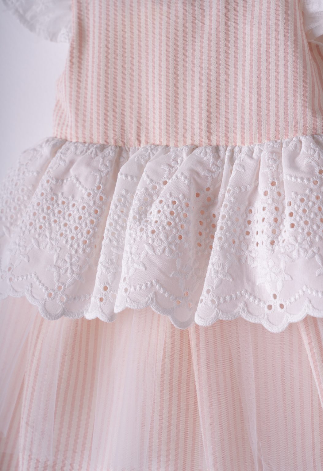- Dress is in a ivory and dusky pink stripe. With little cap sleeves in embroidery anglaise, these have a layer of white net over the top. A band of wide embroidery anglaise round the middle with a layer of net underneath to make it stand out. Fastens with a zip at the back and is fully lined.