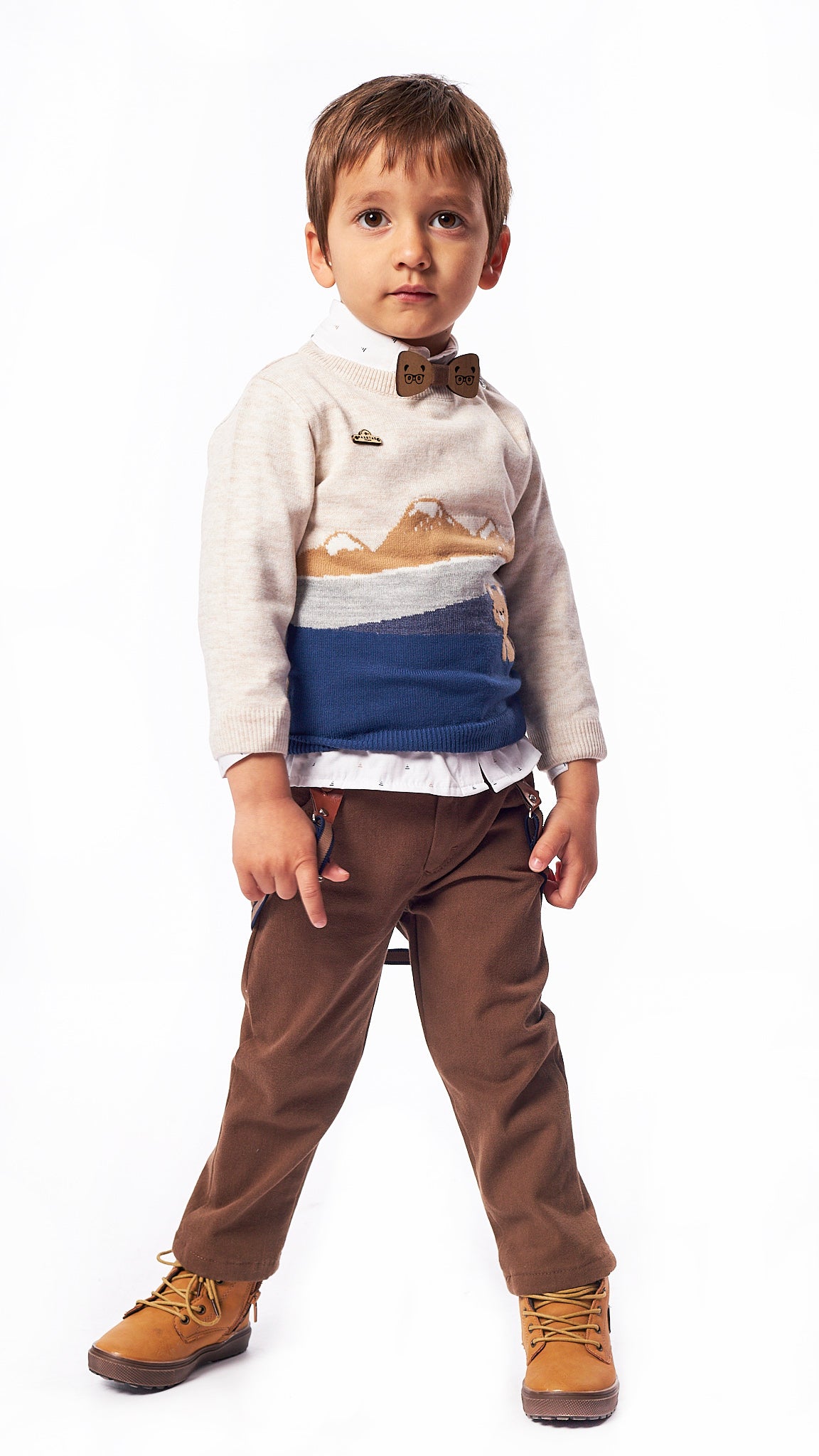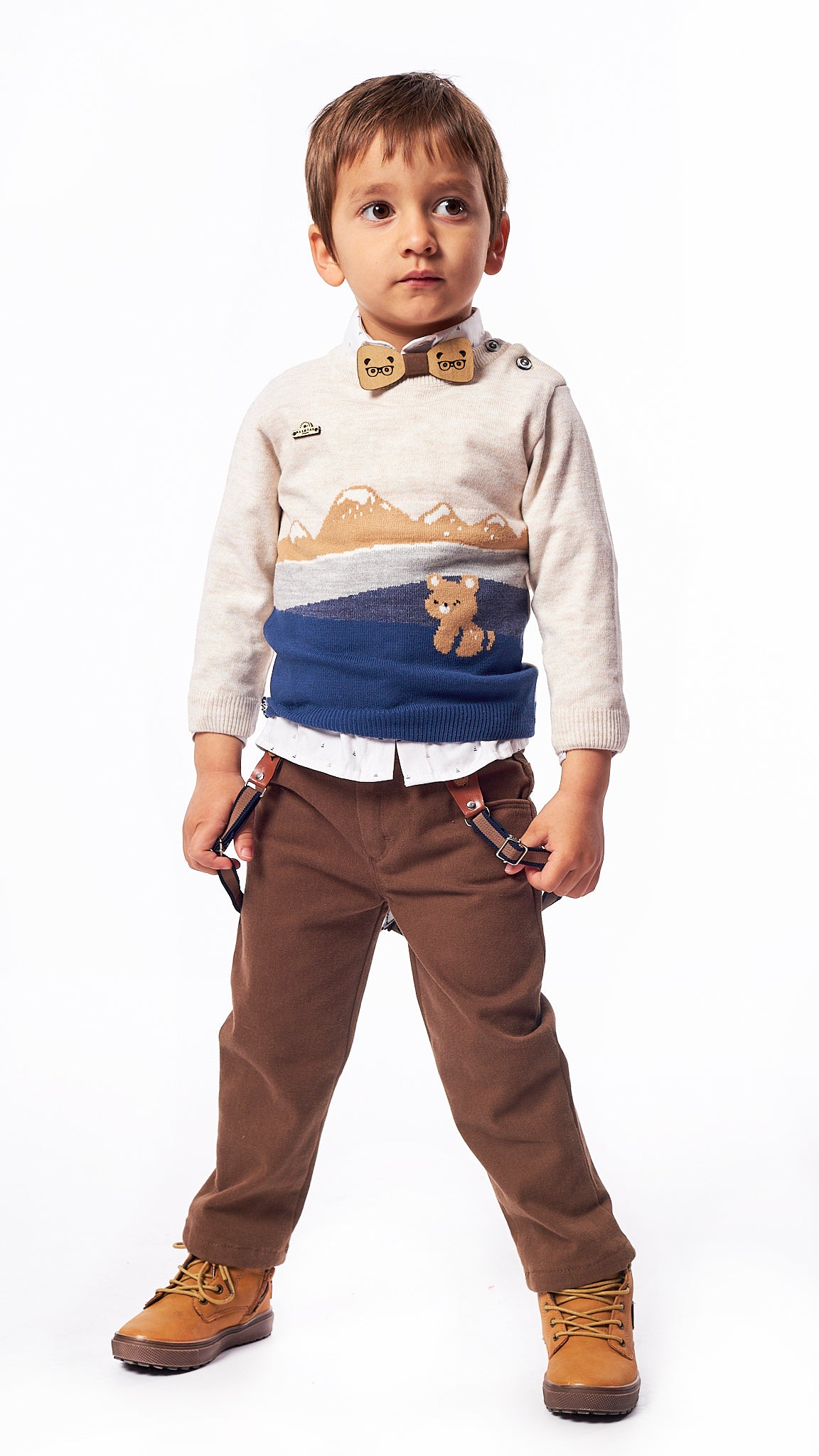 - Jumper is in fine knit in beiges, blue and grey to give a mountain scene with a bear. Buttons on one shoulder for easy of change.