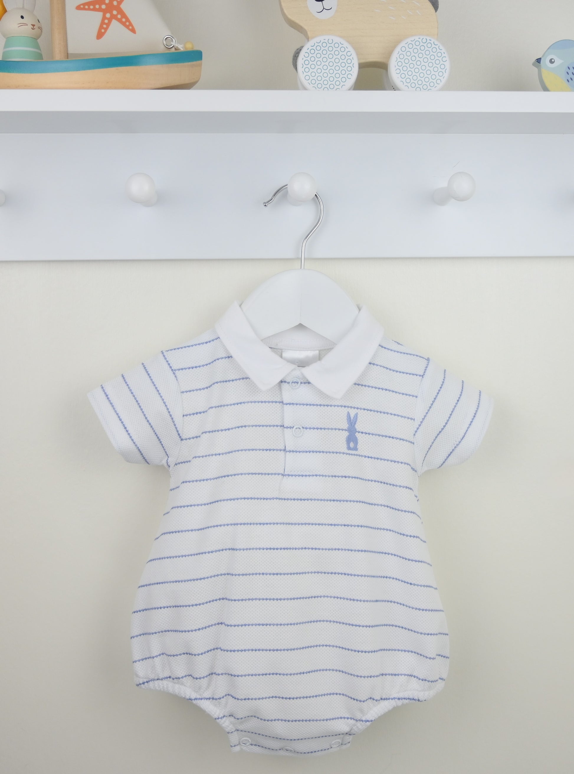 - Main body of the romper is white with pale blue stripes, in a honeycomb material.