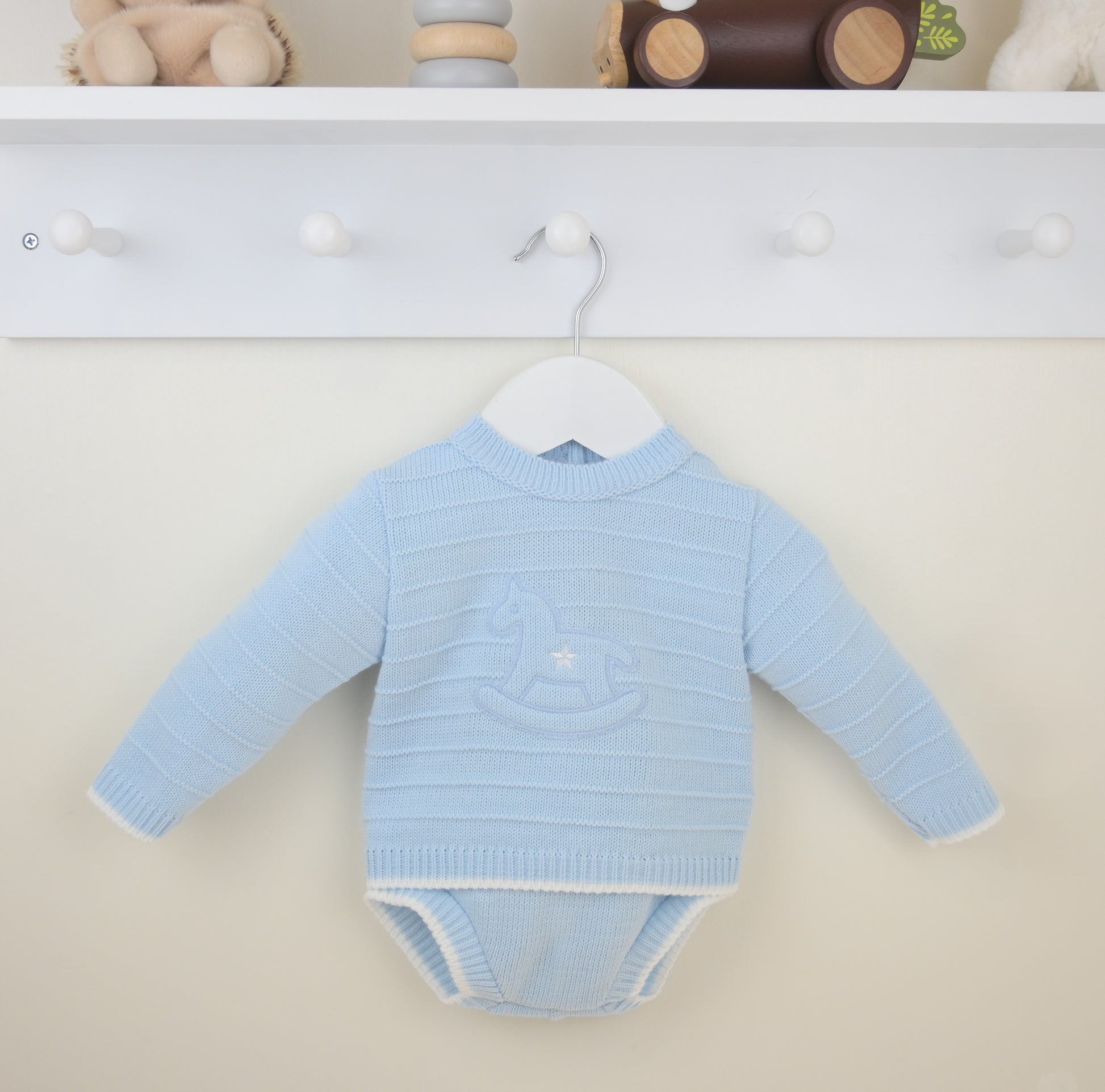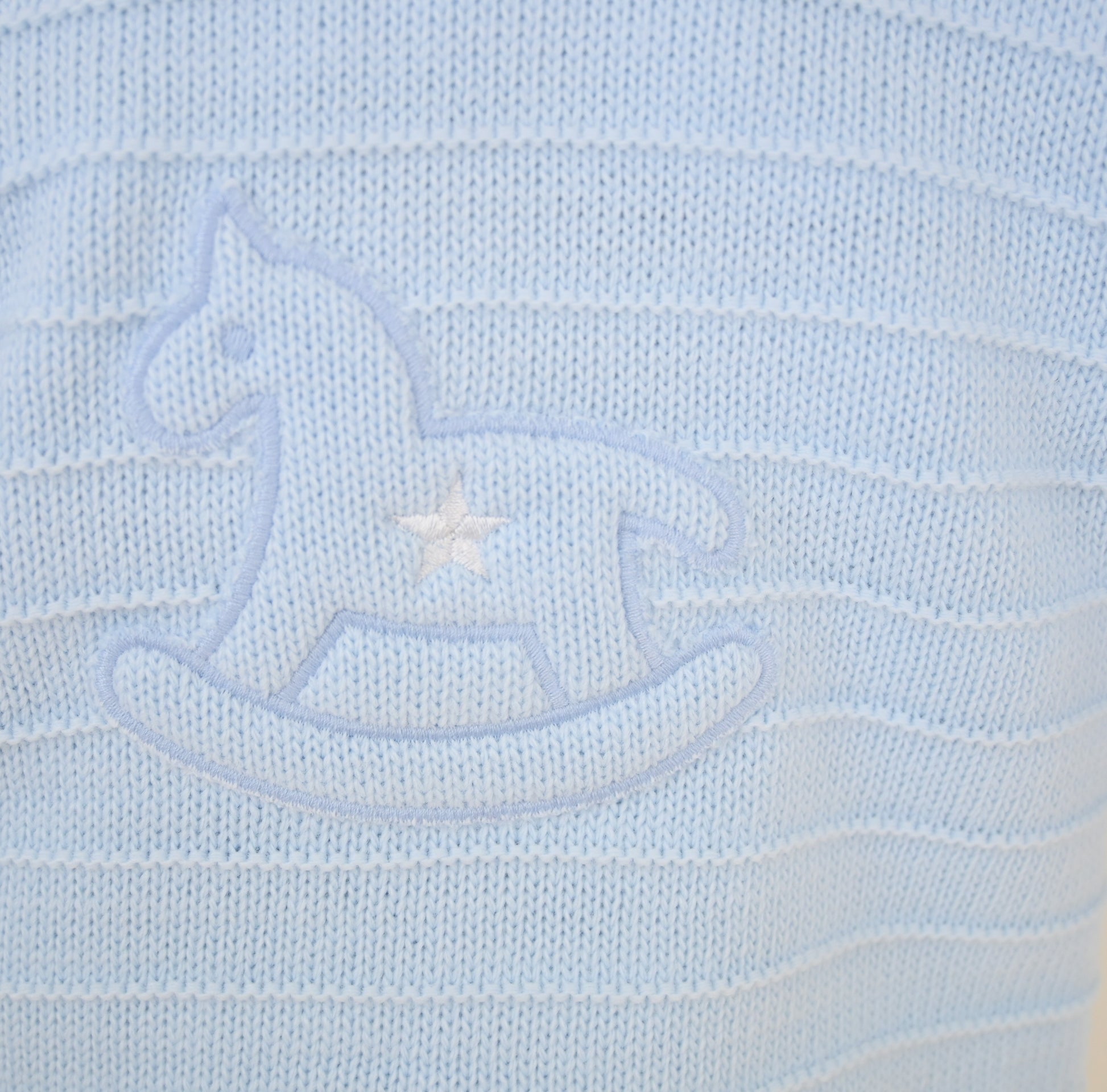 - Jumper has a rib running through with white trim to the sleeve and hem edge. An applique of a rocking horse to the chest with a white embroidered star. Fastens all the way down the back with pale blue buttons.