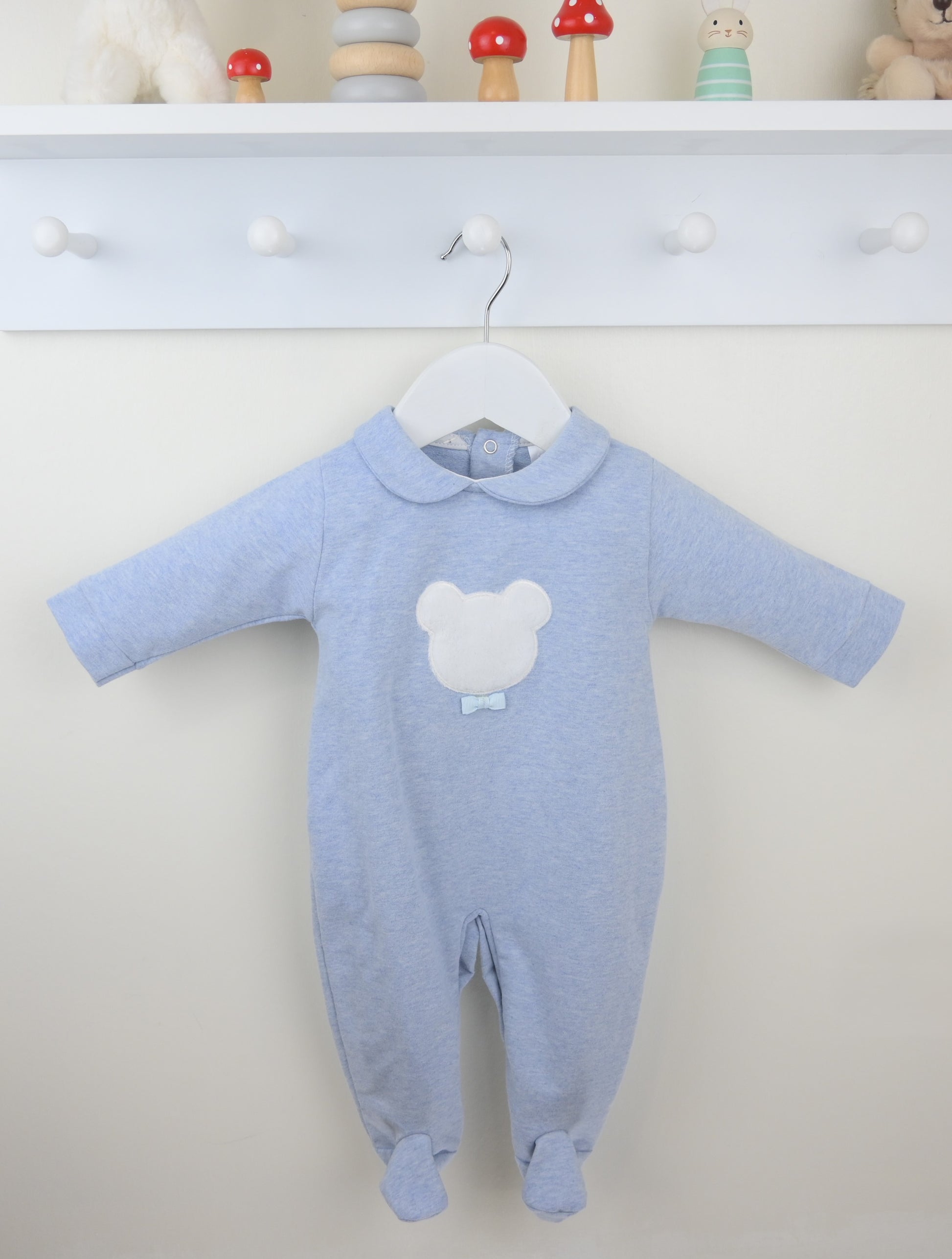 - Baby boys pale blue sleepsuit with bear applique.