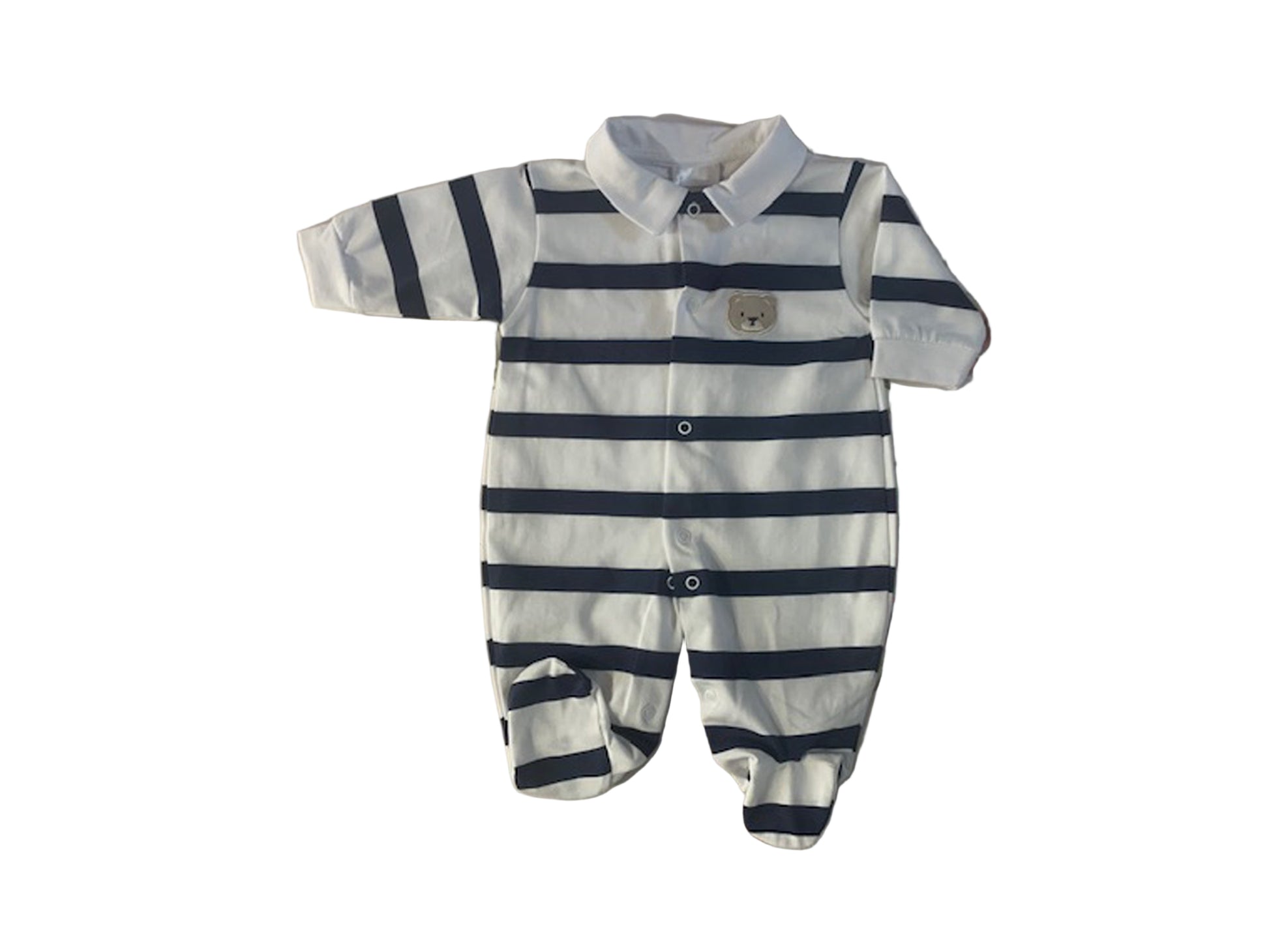 - Navy and white broad stripes with an applique of a teddies face to the top left side.