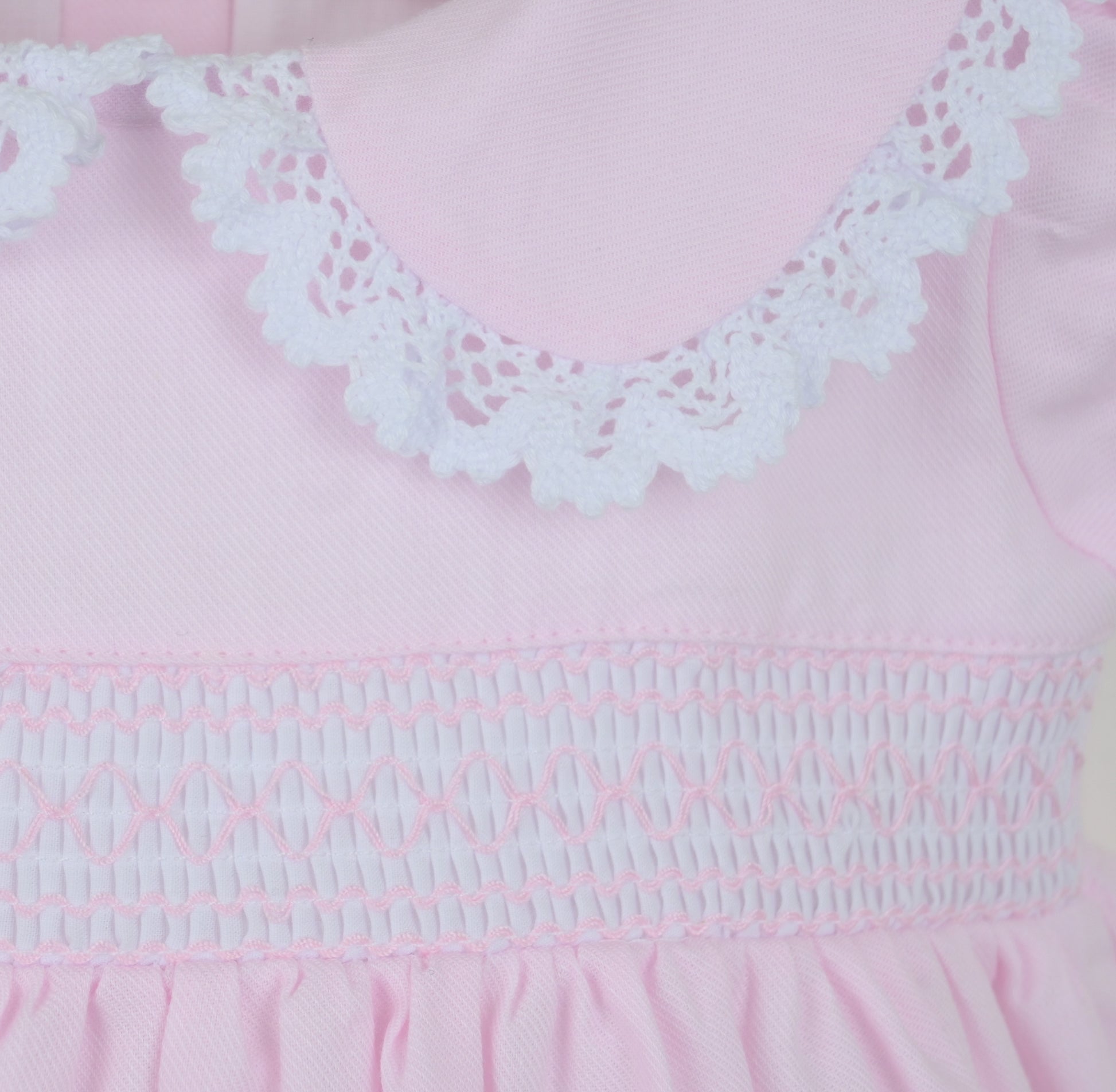 - Cute rounded collar trimmed with white lace. A central band to the chest in white with pink smocking.