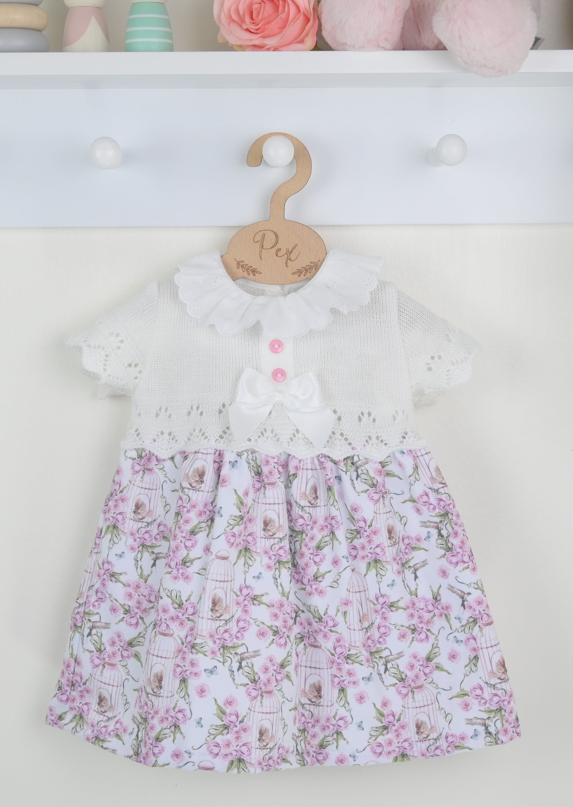 - The lower section, or main body of this dress is white with an all over print. The print has bird cages, birds, butterflies and a pink floral with green leaves.