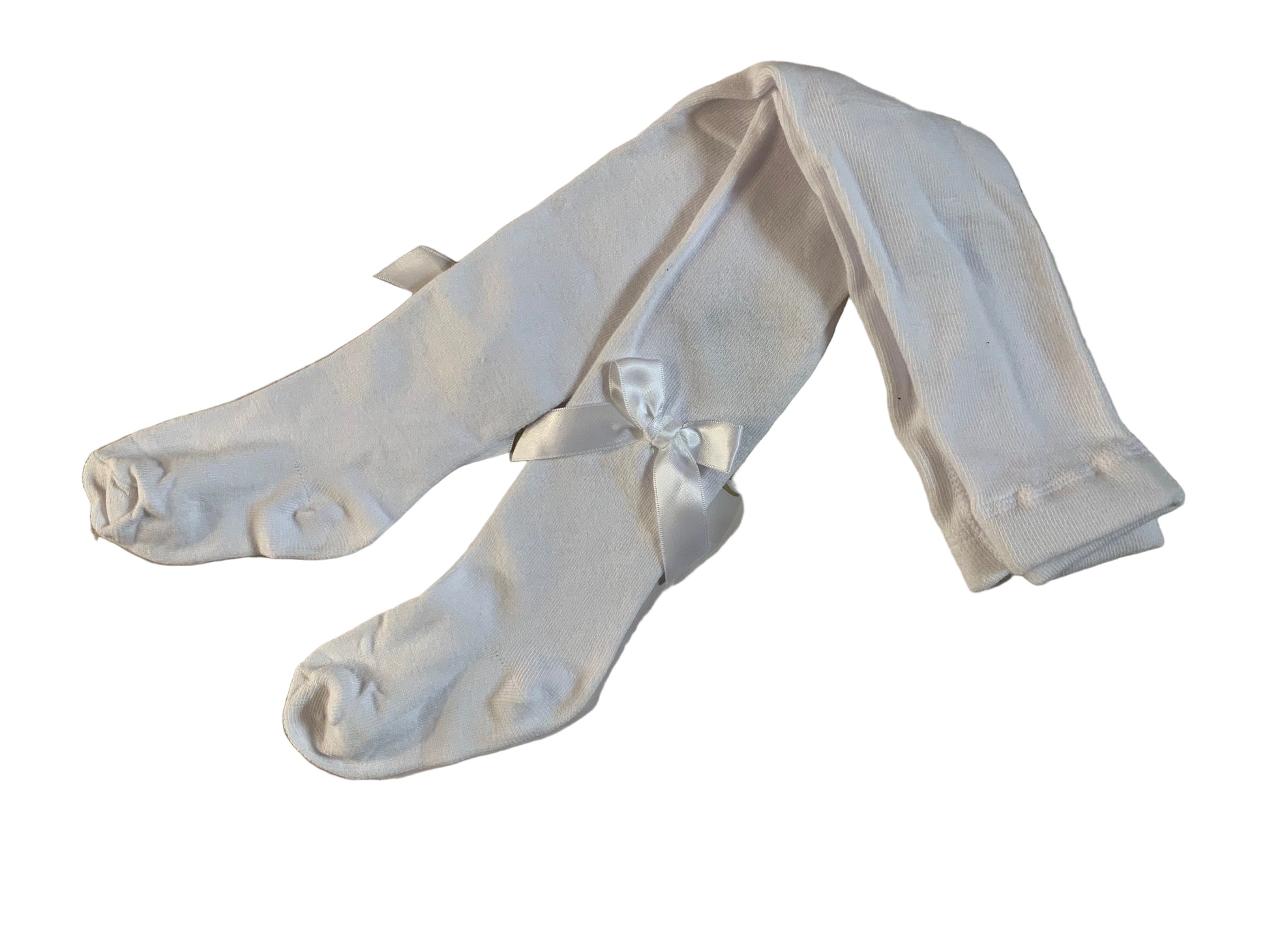 - Thick girls white tights with white ribbon bow to the side of the leg above the ankle.