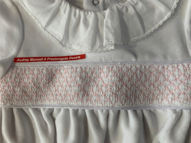 - Panel of smocking with pink embroidery to the chest. A band of white piping above and below the smocking.