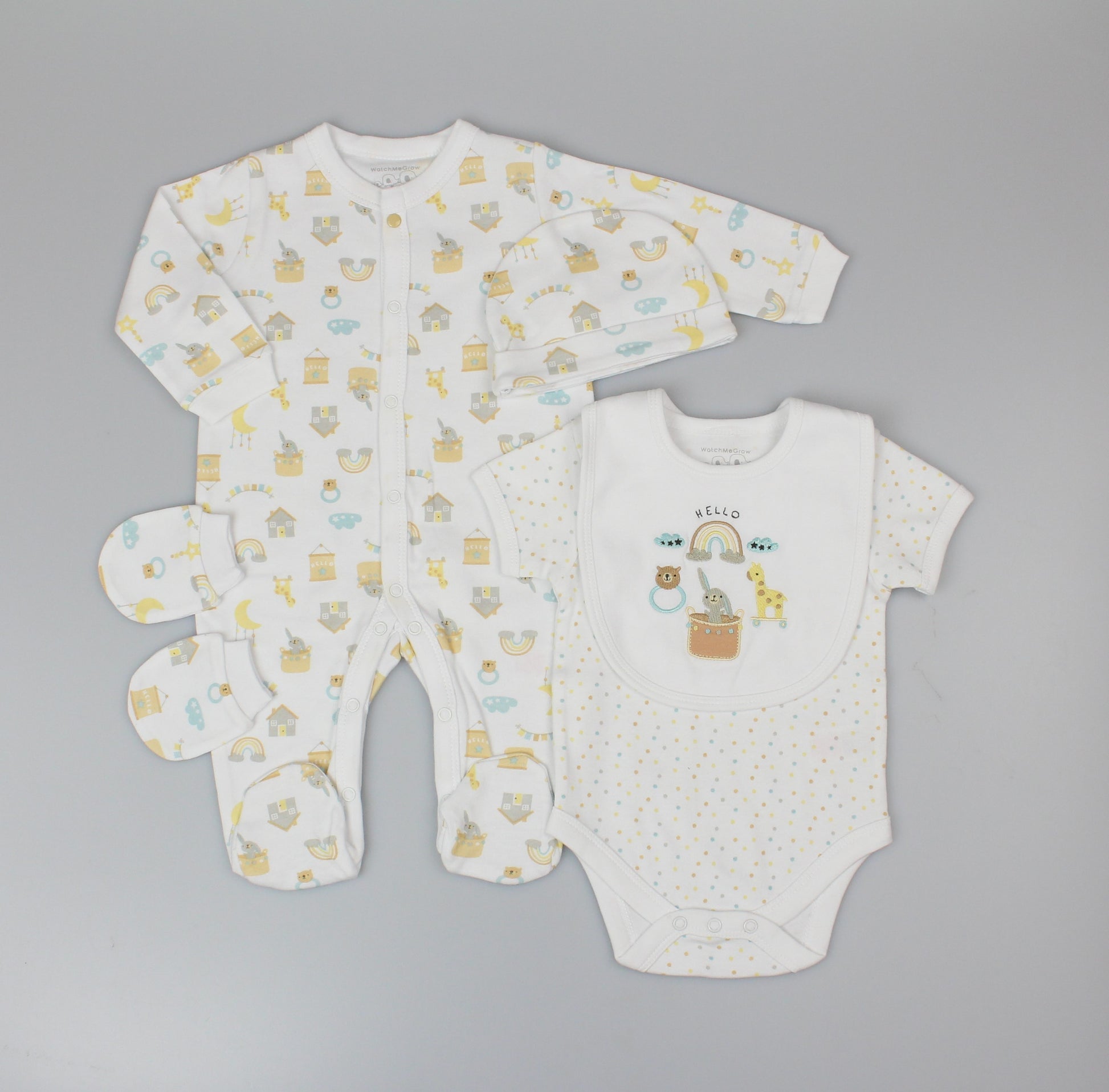 - Five piece set of bib, body vest, baby grower, hat and mittens.